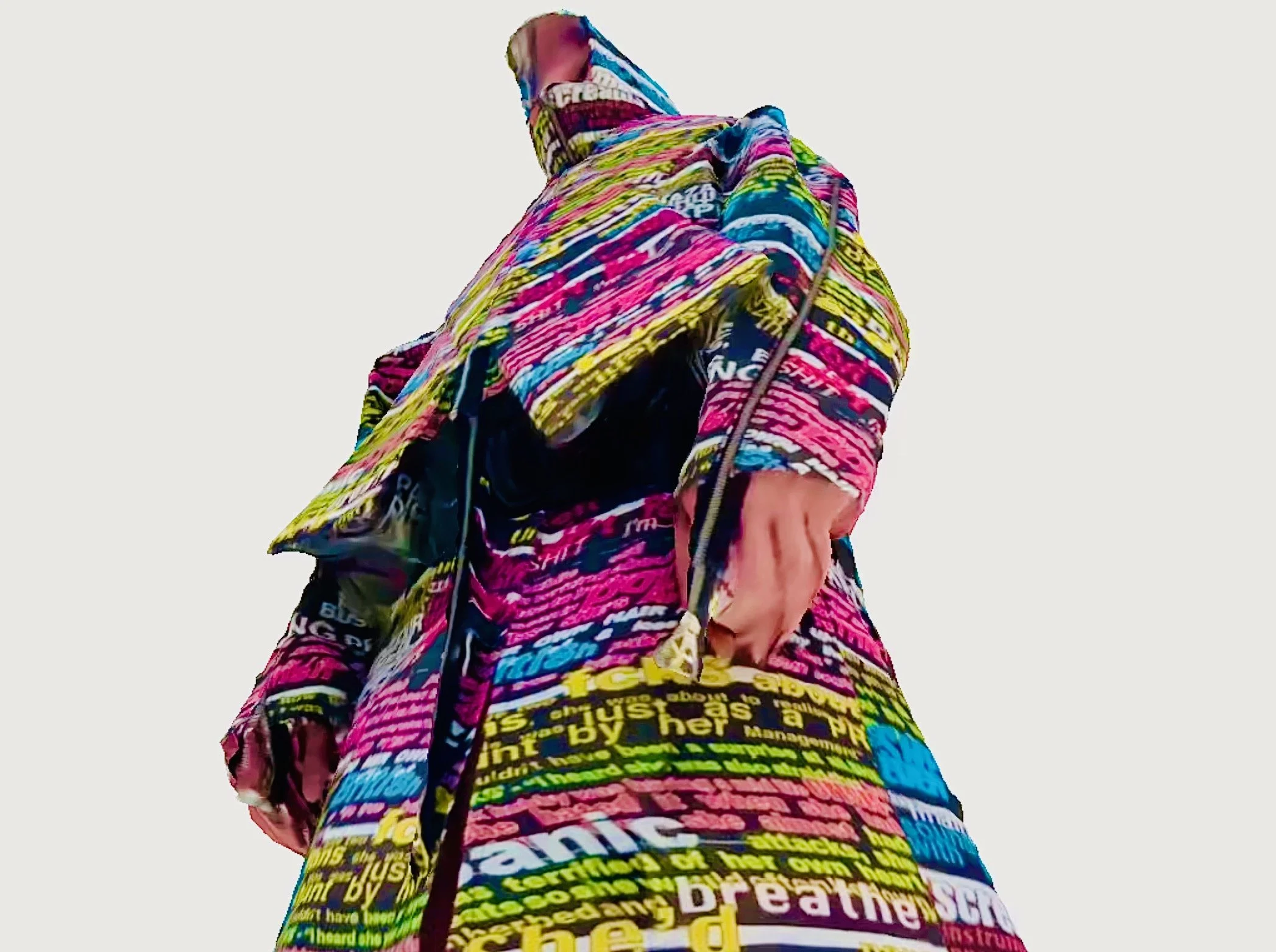 A capsule collection that explores how technology truly perceives us - Featuring AI created textile prints consisting of generated API opinions reacting to social media. posts.